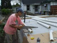 It's September 2007 After taking a weeks break we got back into the swing of things... by working on the electrical plan. We had completed most of the kitchen, the inglenook and the entry. Now we had to do the guest room and the upstairs. With the slab in place we were able to map out the rooms with sticks and walk through as we pondered the location of lights, switches and outlets. |
