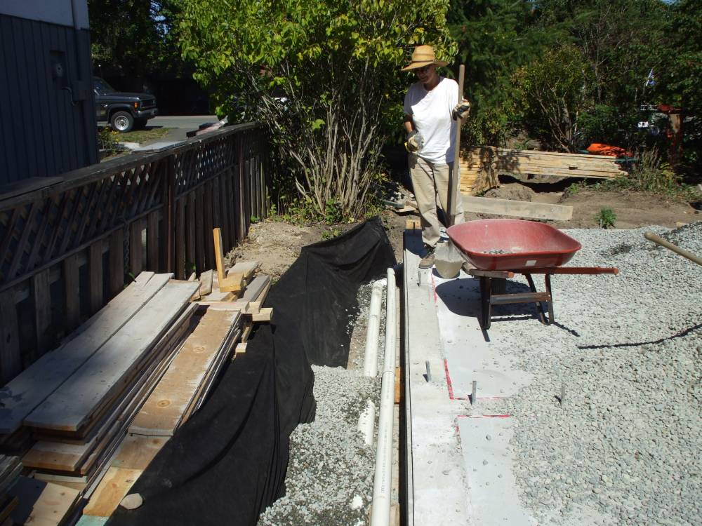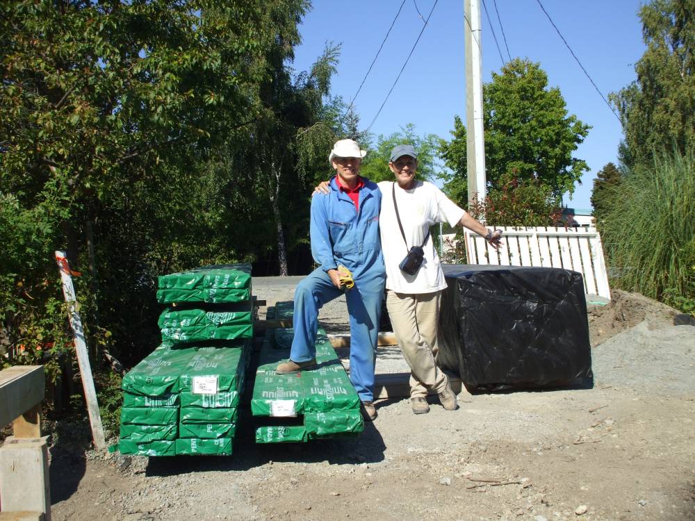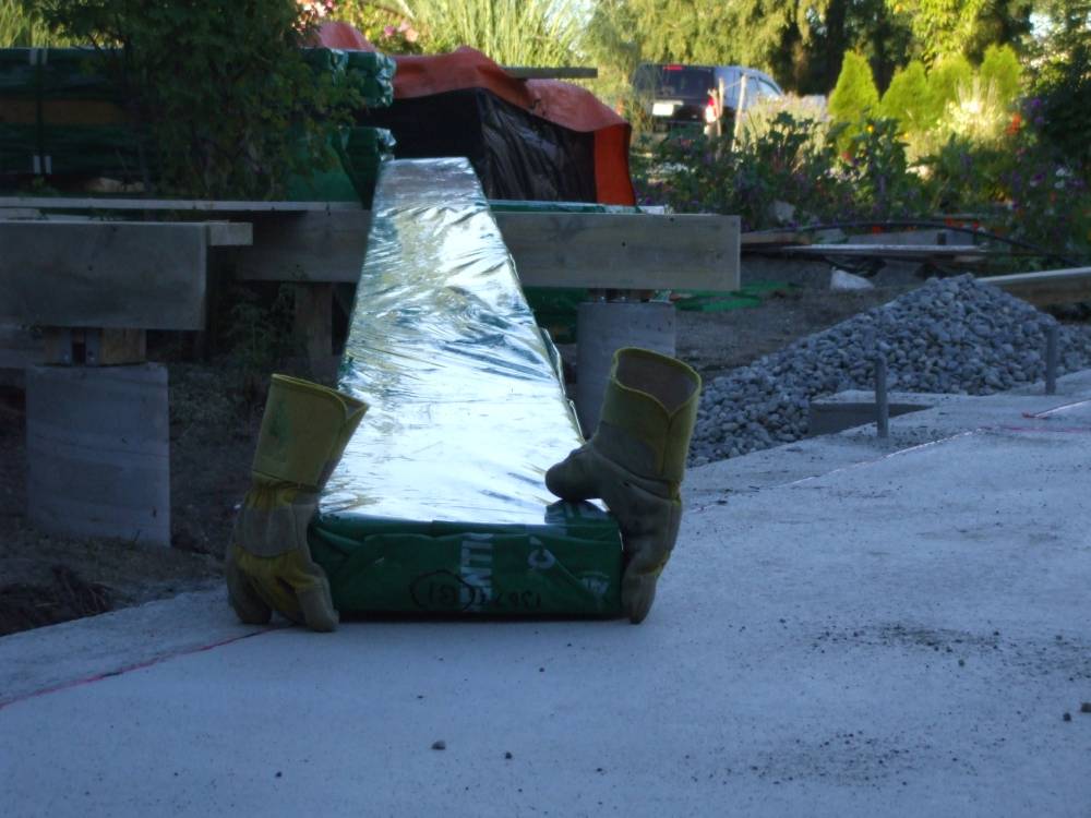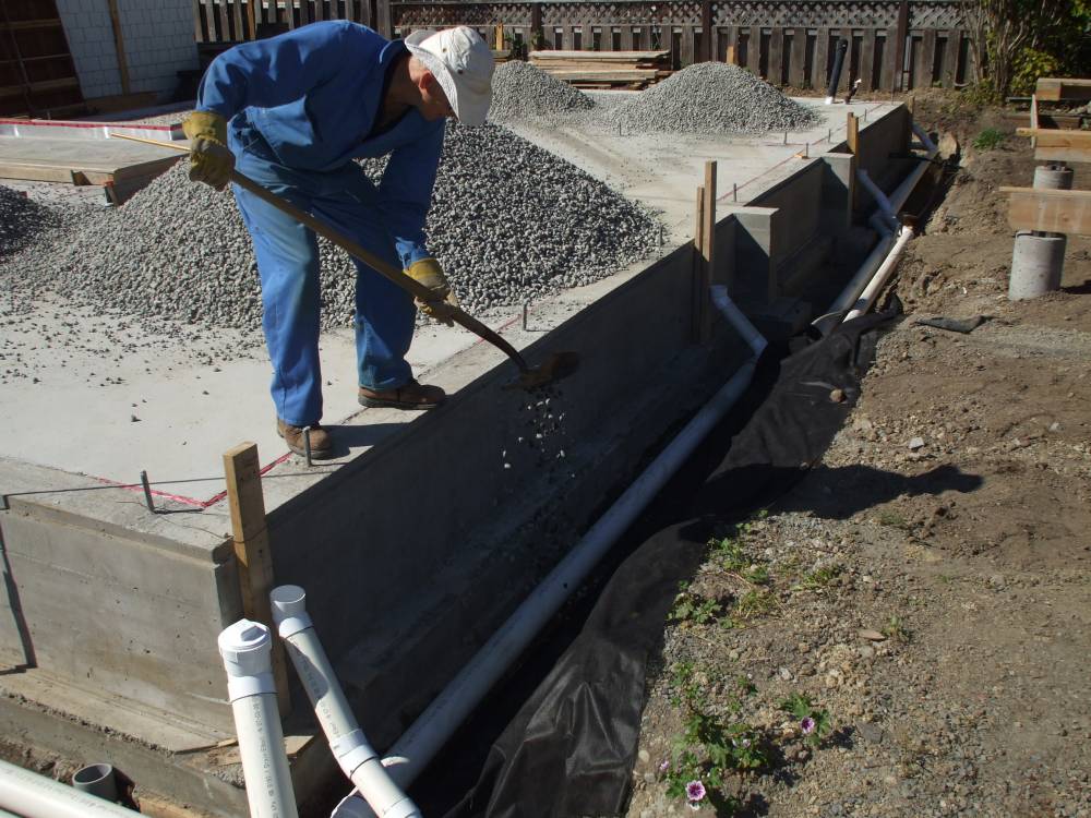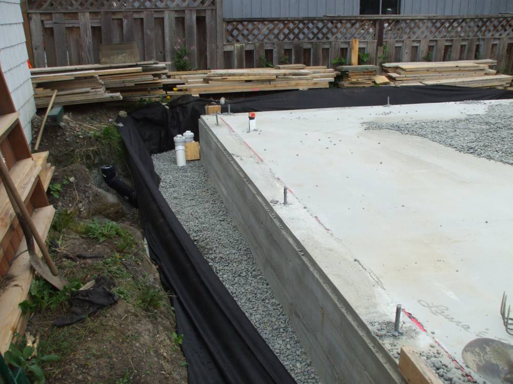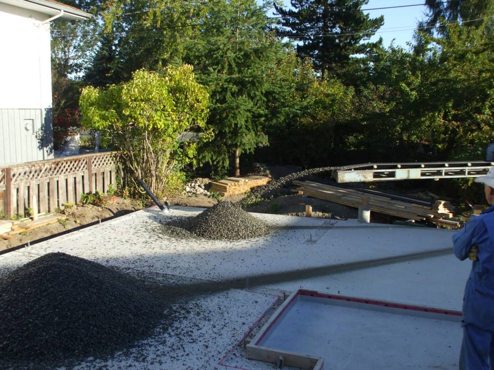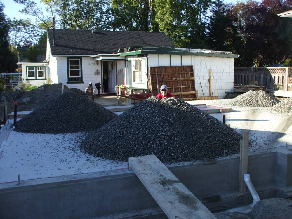 At eight this morning the slinger arrived with 11 tonnes of drain rock. Instead of slinging it directly over the pipe we had them dump it onto the slab in piles strategically located to allow us to backfill by hand. Andre came by later in the morning to inspect our drainage system and gave us the thumbs up to backfill. We decided however to focus instead on preparing for the arrivals of our glulam beams and our FSC certified roof decking. Both are a bit ahead of schedule so they need to be properly stored while we commence framing. We also took the opportunity to scour the site for some unwanted concrete remnants and other inert items we could use as fill around the pillars of the front porch. |