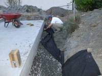 Alas our roof decking was delayed by a couple of days and so we did end up changing gears again and started the process of backfilling. We decided to use landscape cloth to protect the drain rock from silting up. A little excessive perhaps but to us it made a lot of sense. Having the drain rock on the slab worked well however it did mean we had to shovel 11 tonnes of rock and another five or six of sand, carefully placing rock, sand and soil in just the right sequence to facilitate proper water flow. | |||
