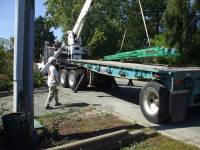After a little delay and some confusion as to how our roof decking was transported from the finishing mill in Horsefly to our chosen freight company the crane truck arrived this afternoon with both orders. Now we have our roof decking and our glulam beams stacked and wrapped in the driveway. Before we can proceed with framing we must now select the right stain and application method, apply the first coat and then store them safely out of the wind and rain for the next few months. Since the largest of the Glulams weigh in at over 175 pounds it was good to have an extra set of hands to help us move them around. |