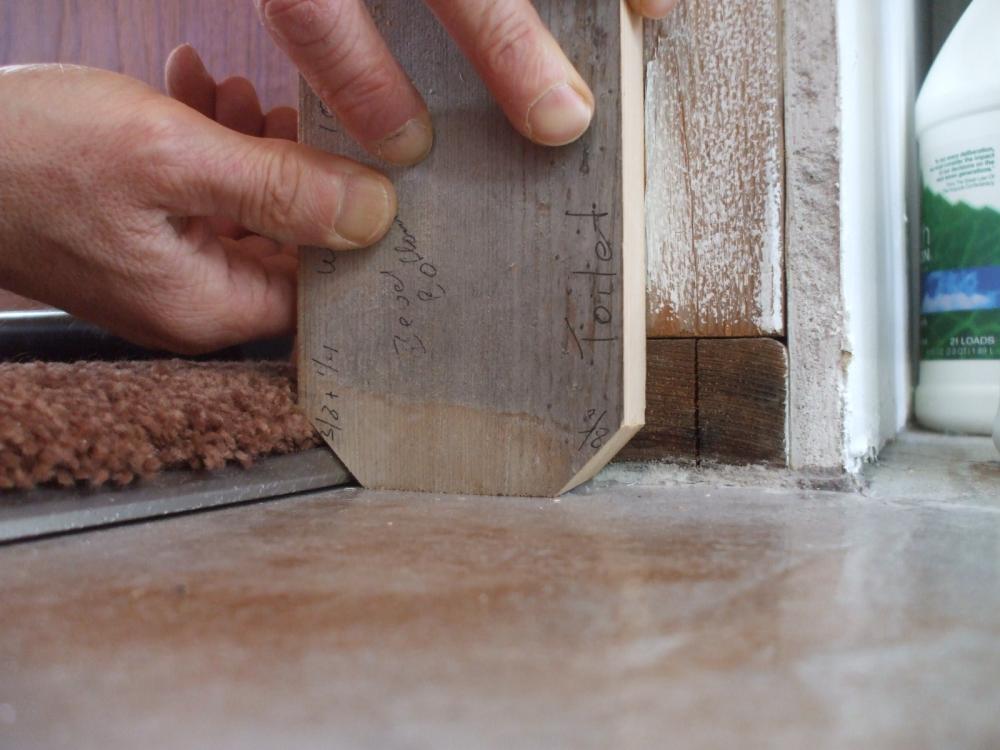 Checking the floor for level | Custom cutting frame bottoms | checking door gaps before hinges are installed | |